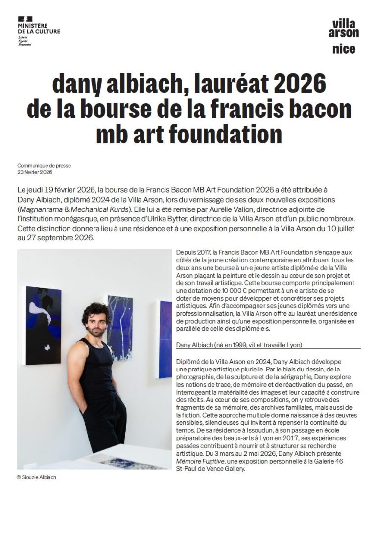 Le jeudi 19 février 2026, la bourse de la Francis Bacon MB Art Foundation 2026 a été attribuée à Dany Albiach, diplômé 2024 de la Villa Arson, lors du vernissage de ses deux nouvelles expositions (Magnanrama & Mechanical Kurds). Elle lui a été remise par Aurélie Valion, directrice adjointe de l’institution monégasque, en présence d’Ulrika Bytter, directrice de la Villa Arson et d’un public nombreux. Cette distinction donnera lieu à une résidence et à une exposition personnelle à la Villa Arson du 10 juillet au 27 septembre 2026.