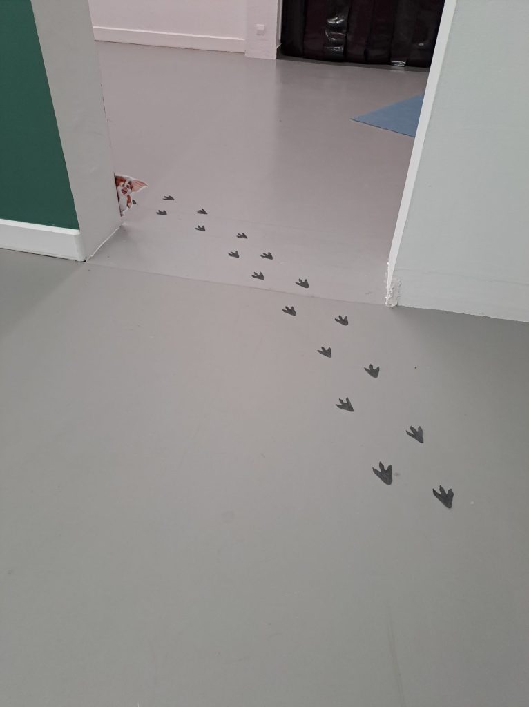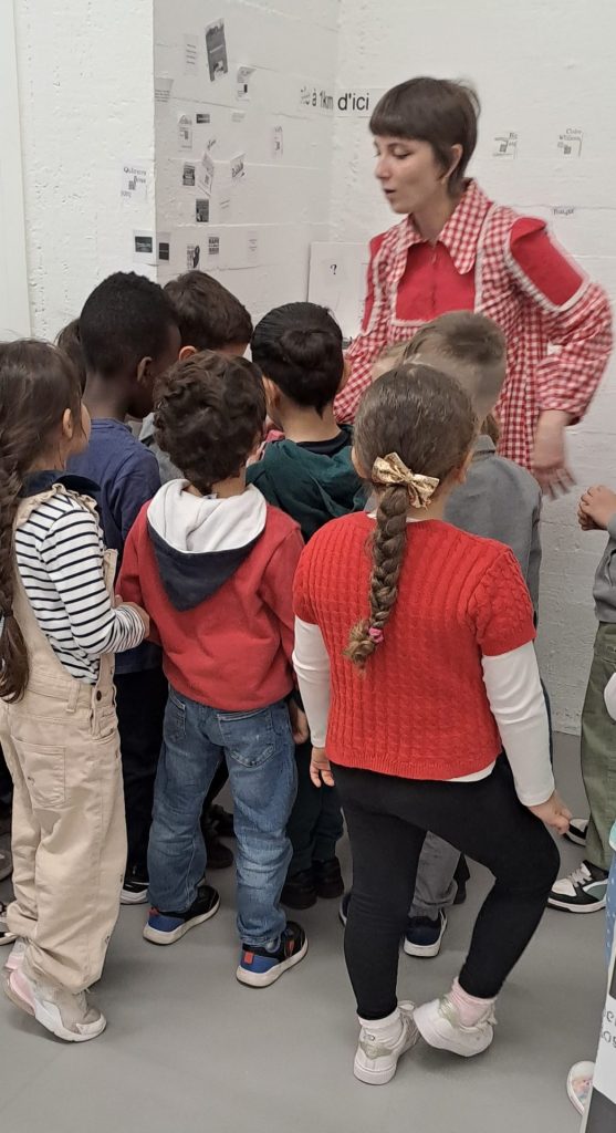 Accompagnés de médiatrices du centre d’art, les élèves de maternelle découvrent l’exposition Magnanrama, Portraits, réseaux et actualités de Nathalie Magnan grâce à une visite interactive sur les machines de l’exposition dont auraient pris possession des créatures espiègles : les gremlins.